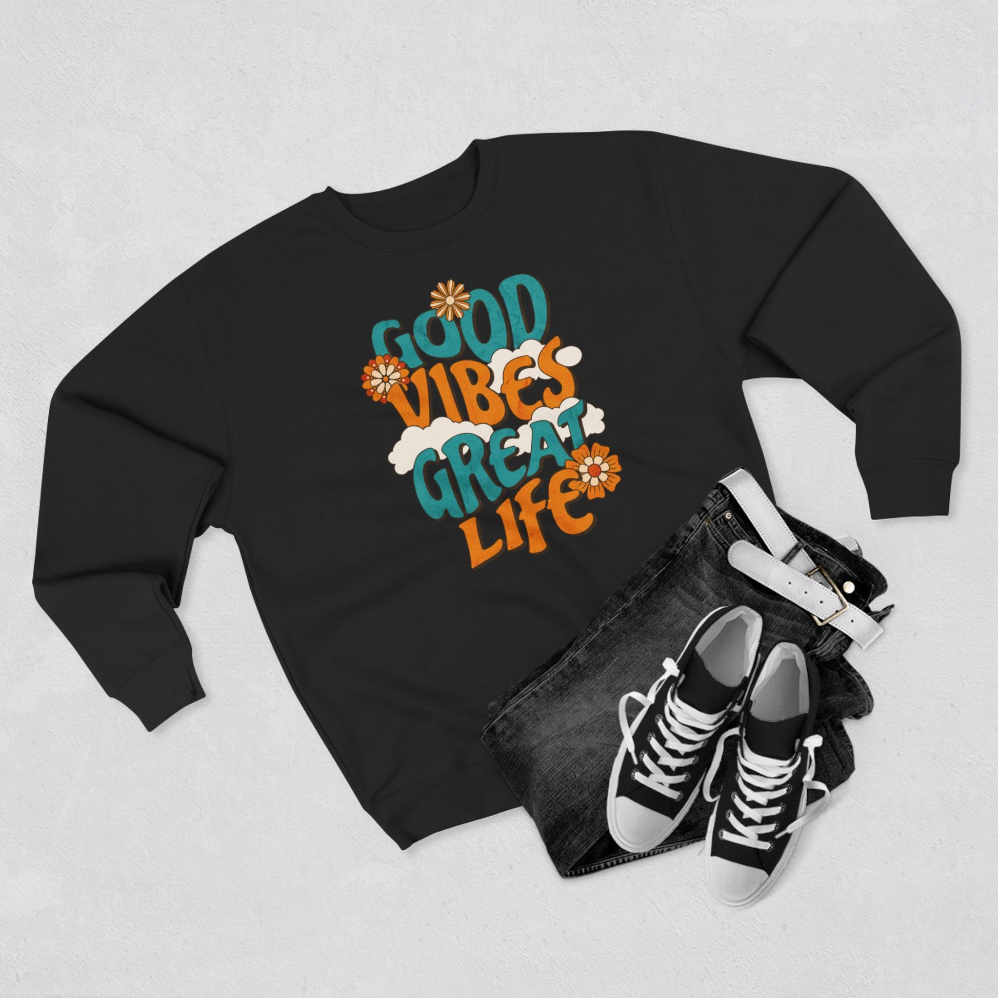Embrace comfort and style with this Unisex Crewneck Sweatshirt, designed to elevate your everyday look. The vibrant 'Good Vibes, Great Life' print radiates positivity, making it perfect for casual outings or cozy nights in. Its medium-heavy fabric offers warmth while remaining breathable, ideal for layering during cooler seasons. Whether you're lounging at home, grabbing coffee with friends, or heading out for a casual day, this sweatshirt fits seamlessly into any lifestyle. It's a great gift for friends and family during holidays, birthdays, or just to spread some cheer. Ideal for anyone who loves comfort combined with a good vibe!