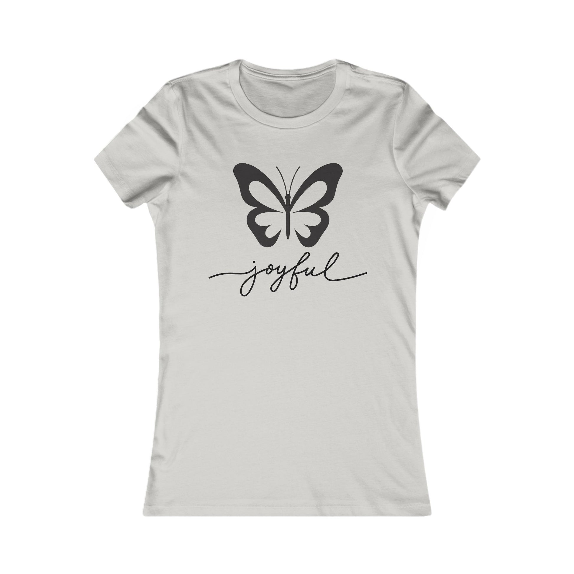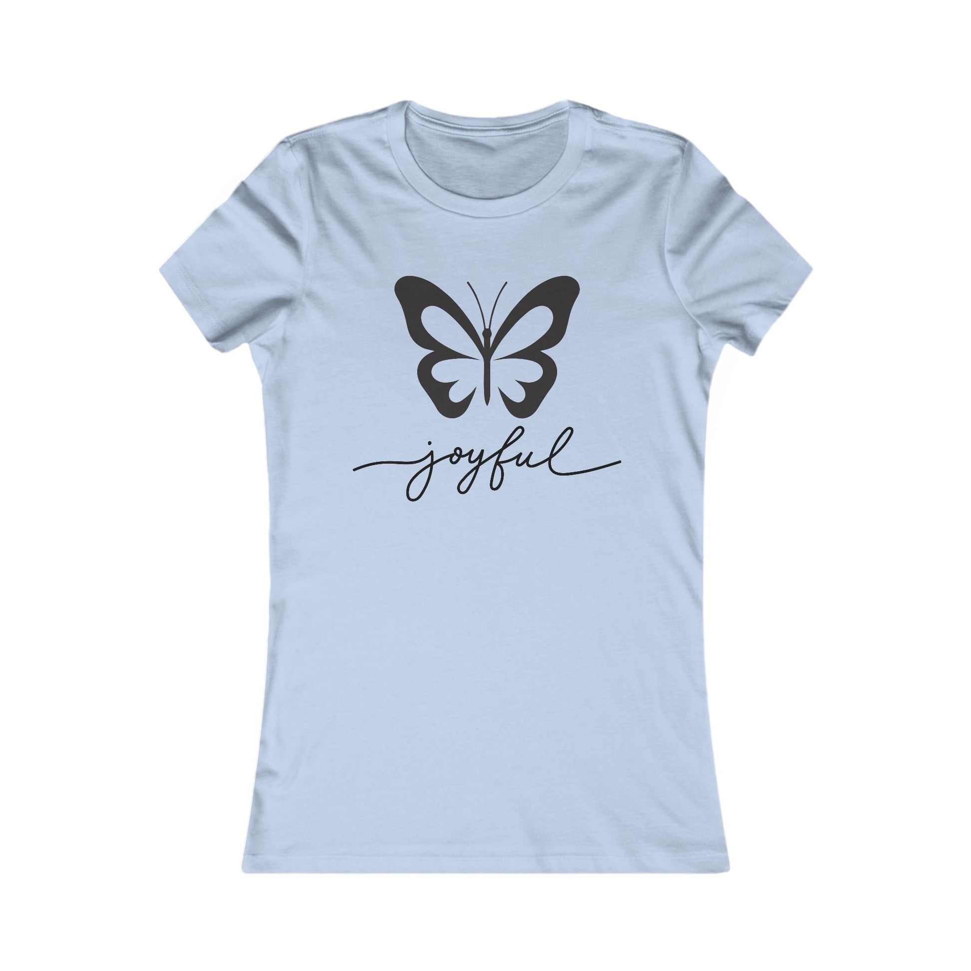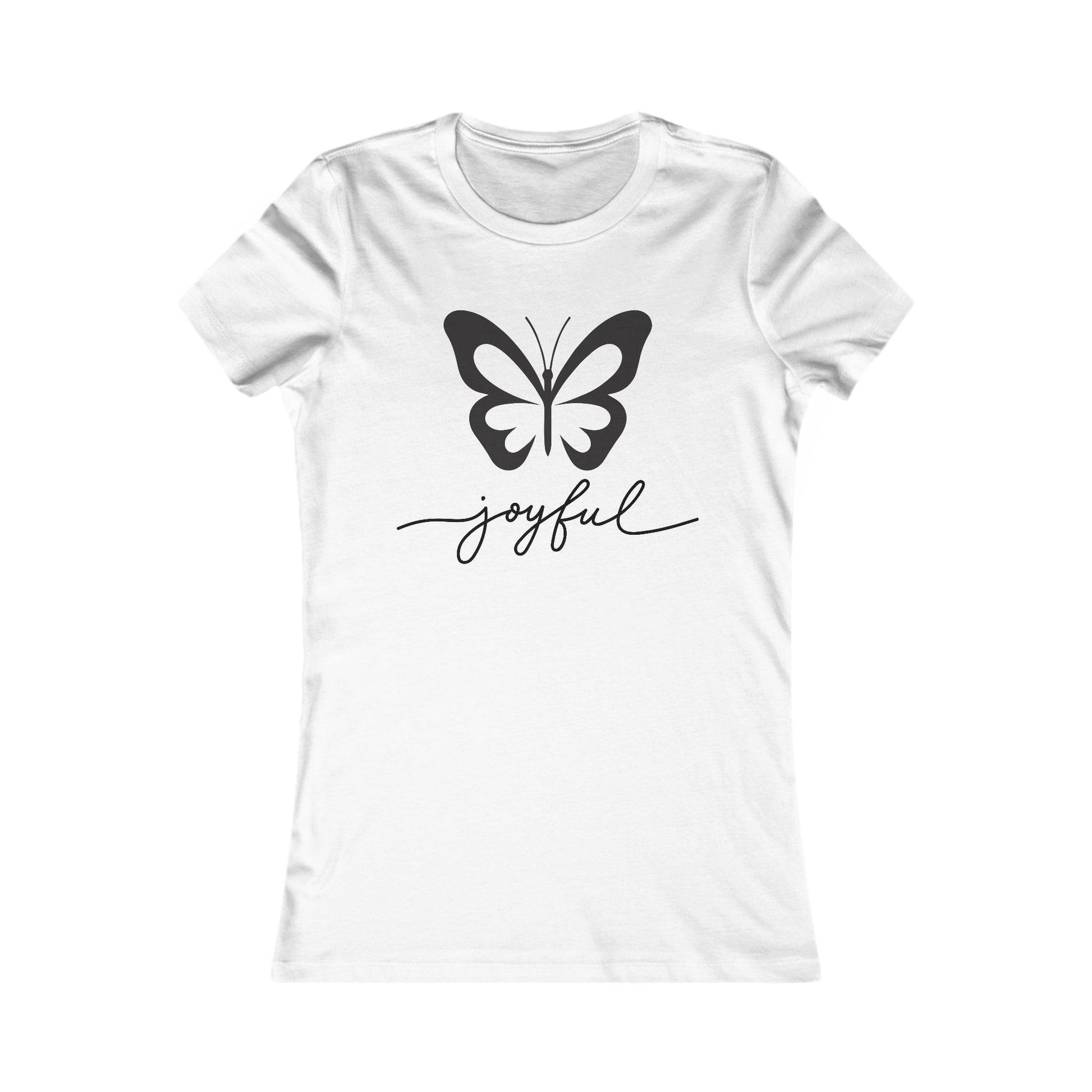 Joyful Butterfly Tee with positive vibes and inspirational graphic design, perfect for casual summer wear. Ideal gift for women, fits into everyday life seamlessly. Relevant for birthdays, holidays, or just to spread positivity.