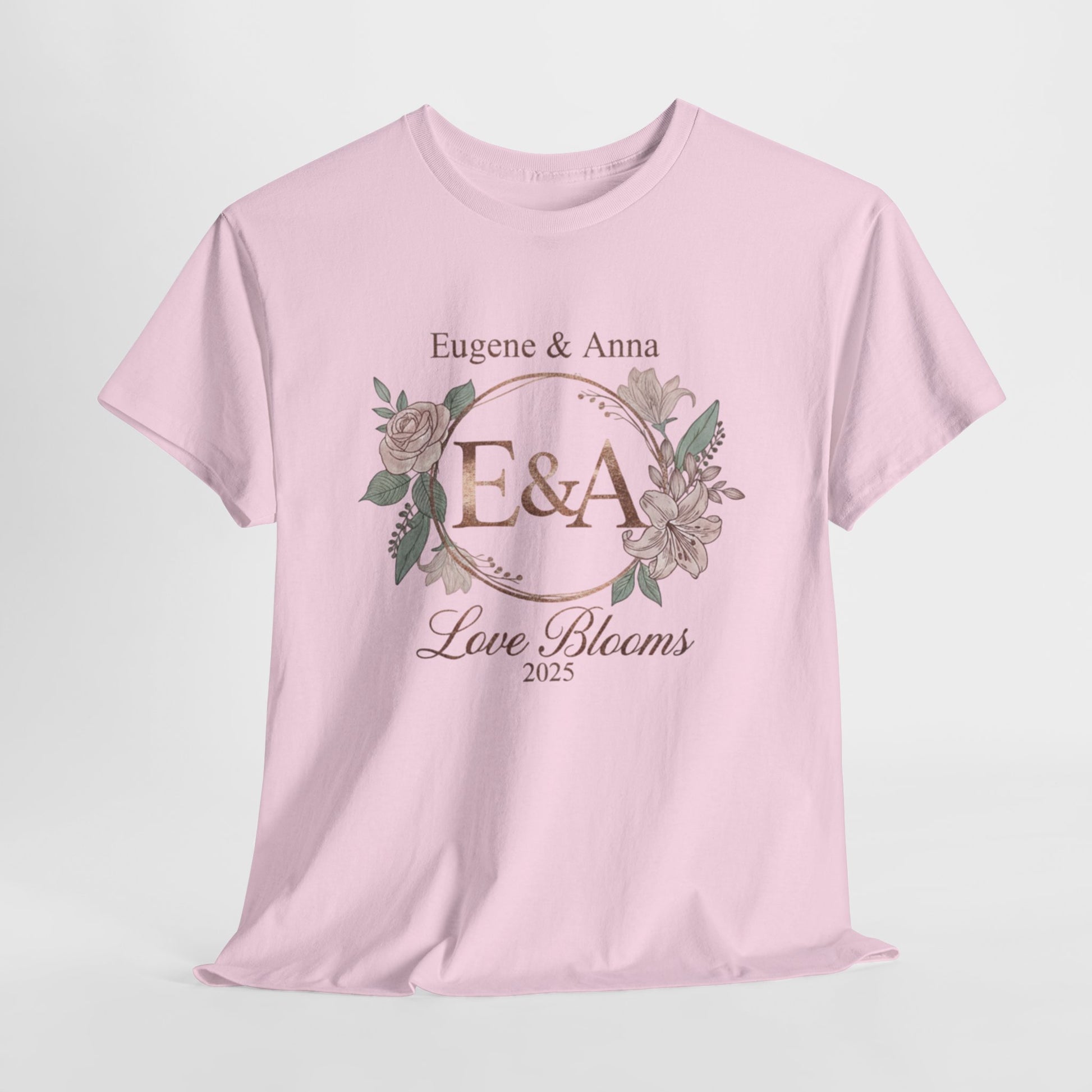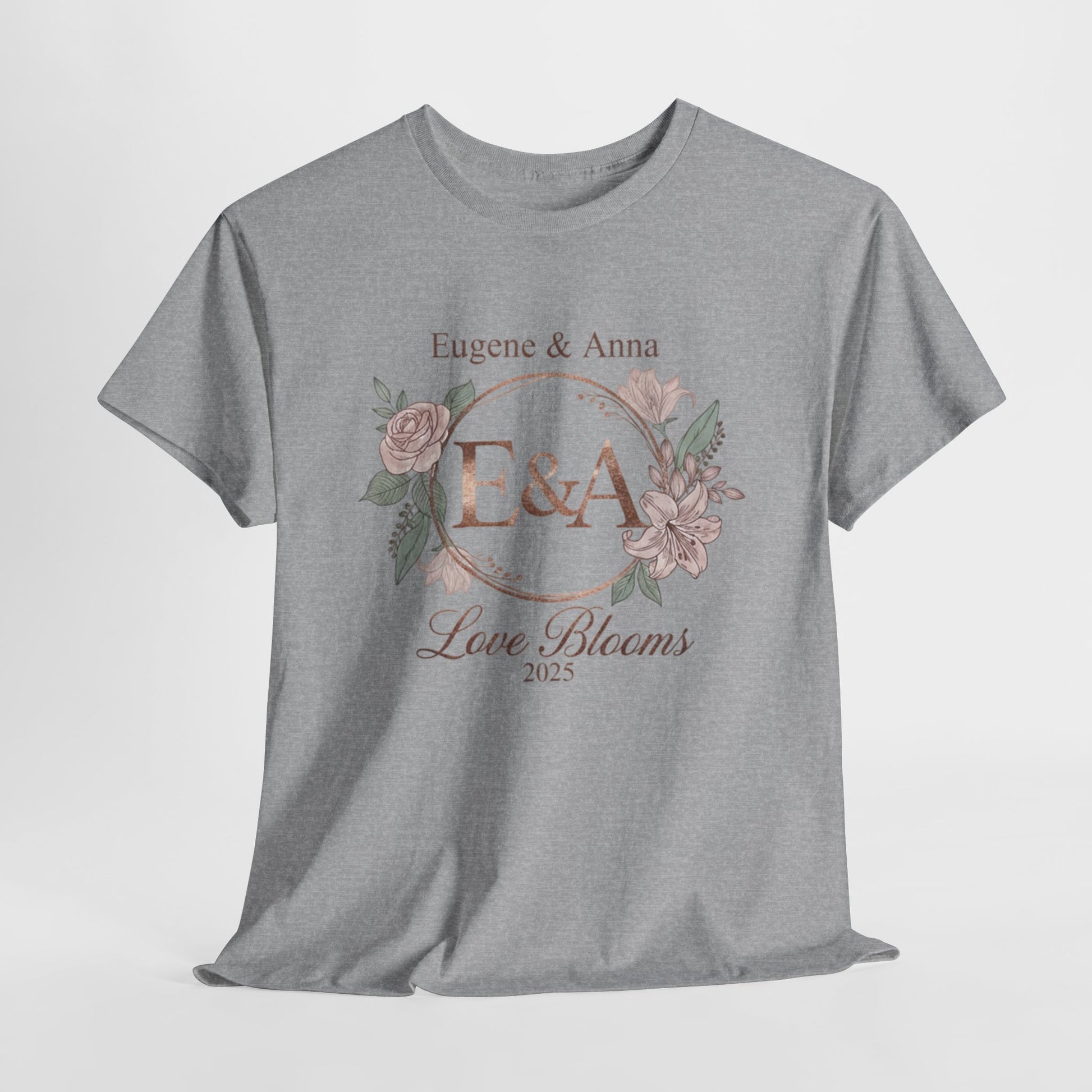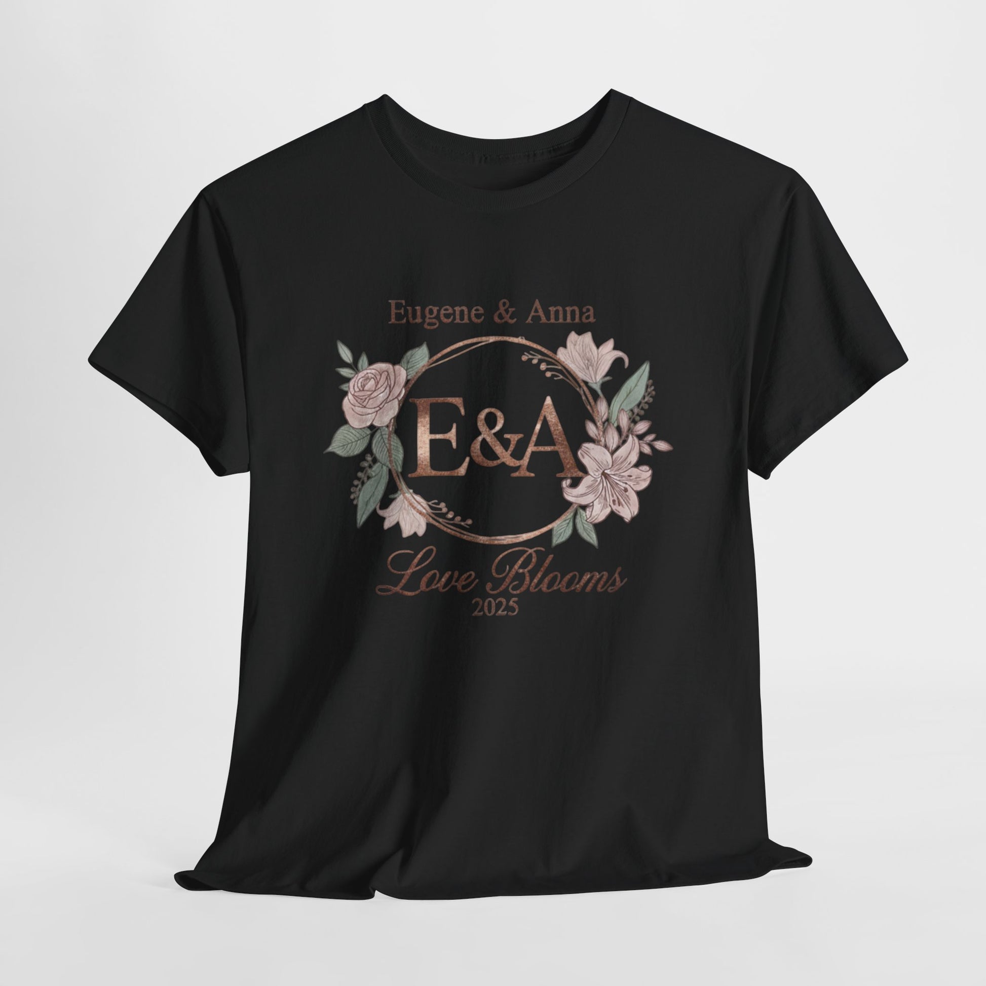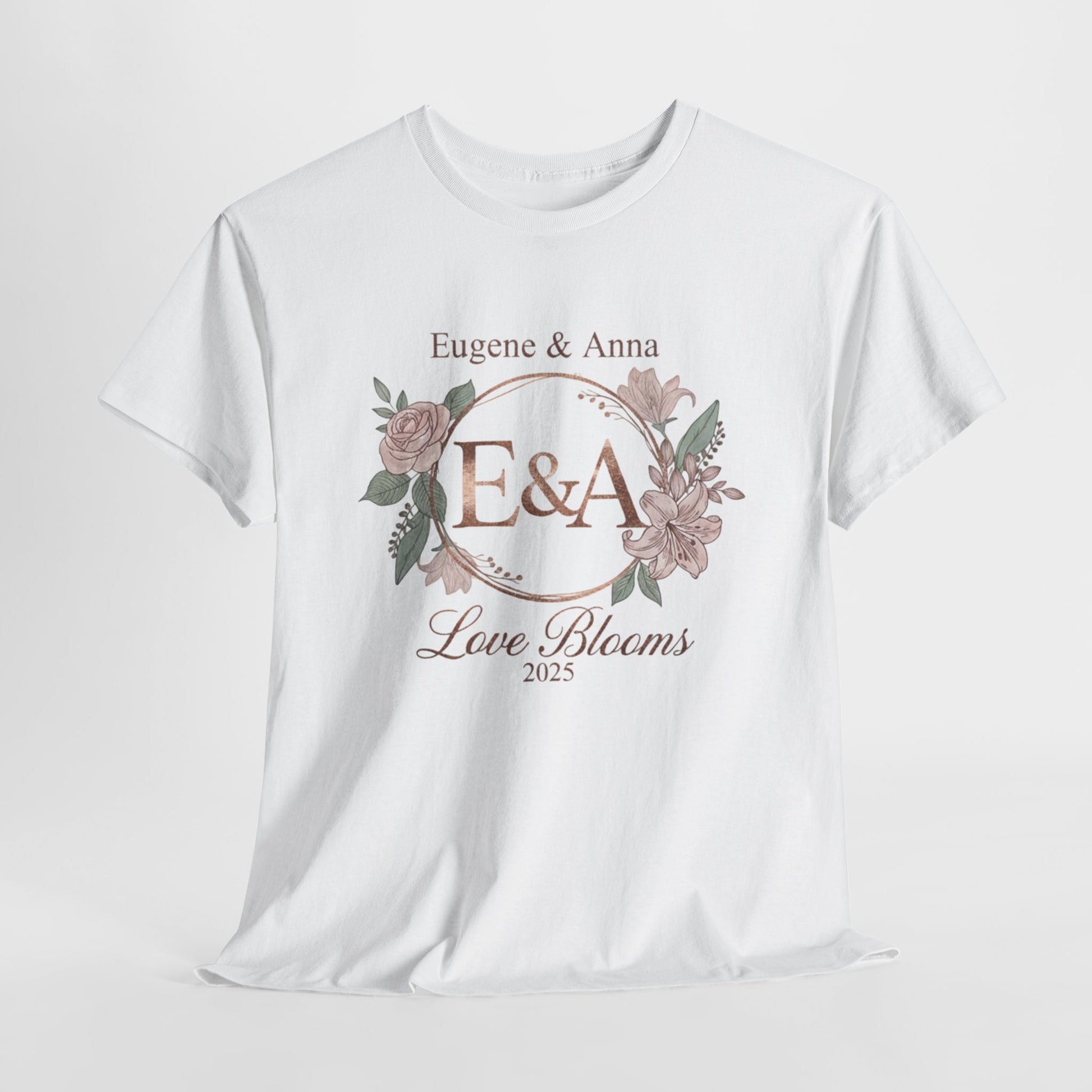 Personalised monogram T-Shirt with the initials 'E & A' and the message 'Love Blooms in 2025'. Perfect for couples celebrating their wedding in 2025, this T-Shirt exudes a romantic and sentimental vibe. Ideal for adults looking for a unique and custom gift for their special day. Relevant for wedding celebrations, anniversary gifts, and couple-related occasions.