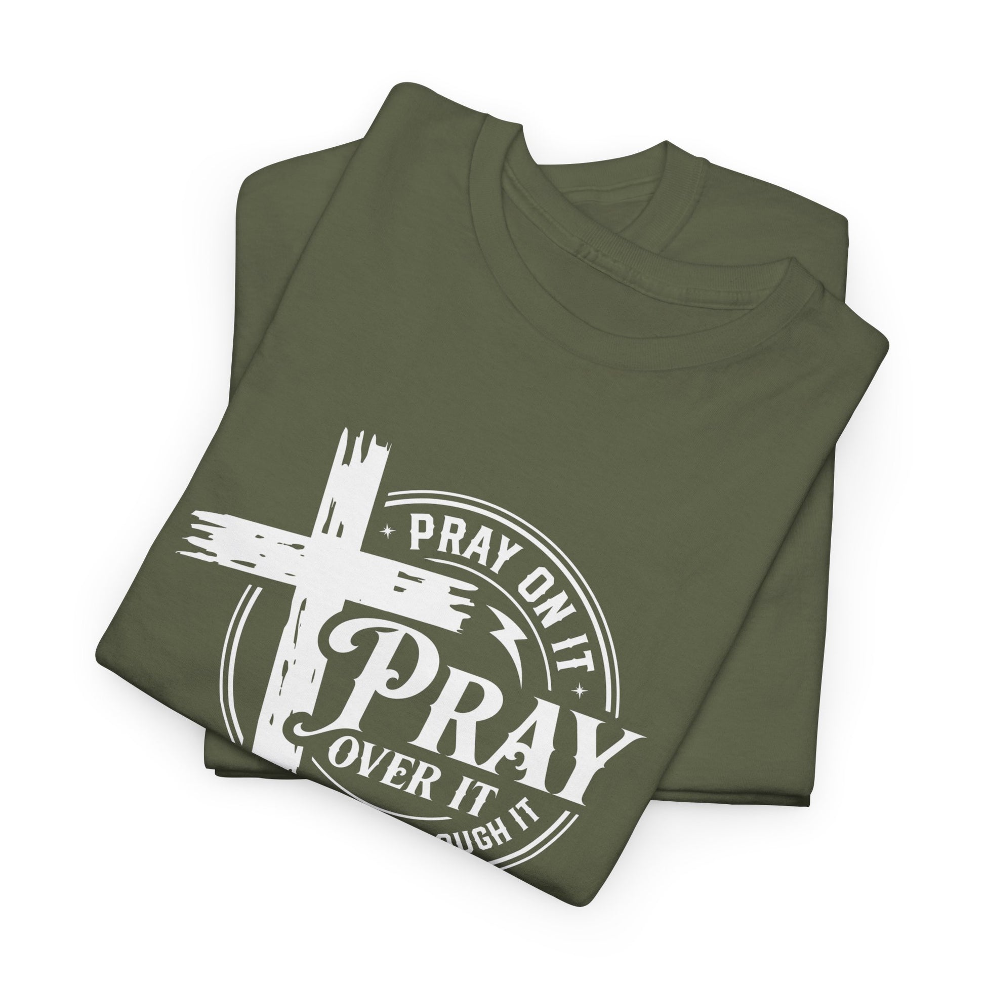 A powerful and spiritually uplifting T-Shirt with the message 'Pray on it, Pray over it, Pray through it'. This tee exudes positivity and faith, making it perfect for those seeking inspiration and comfort in their daily lives. Ideal for spiritual individuals and those looking for a meaningful statement piece, this T-Shirt is suitable for religious gatherings, prayer events, and everyday wear.