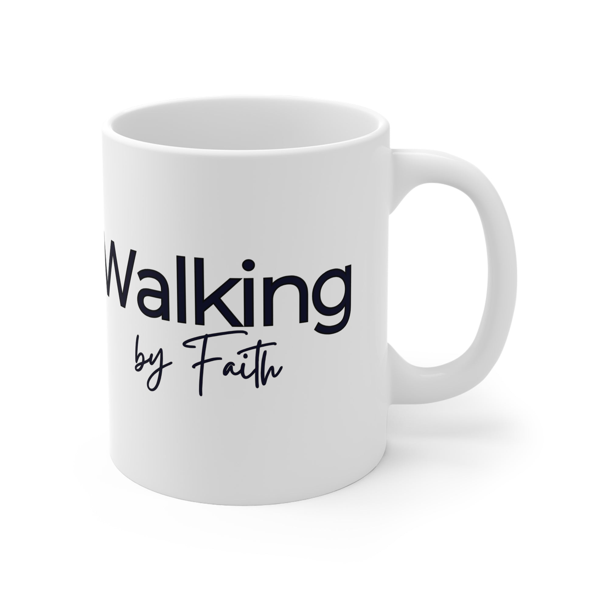 Walking by Faith Coffee Mugs inspired by 2 Corinthians 5:7. Bold declaration of daily trust in God. Perfect for those seeking inspiration and comfort in their faith journey. Great for morning coffee or tea, and a reminder of God's presence throughout the day. Ideal for Christian believers and those celebrating religious holidays and occasions. Also available in Black