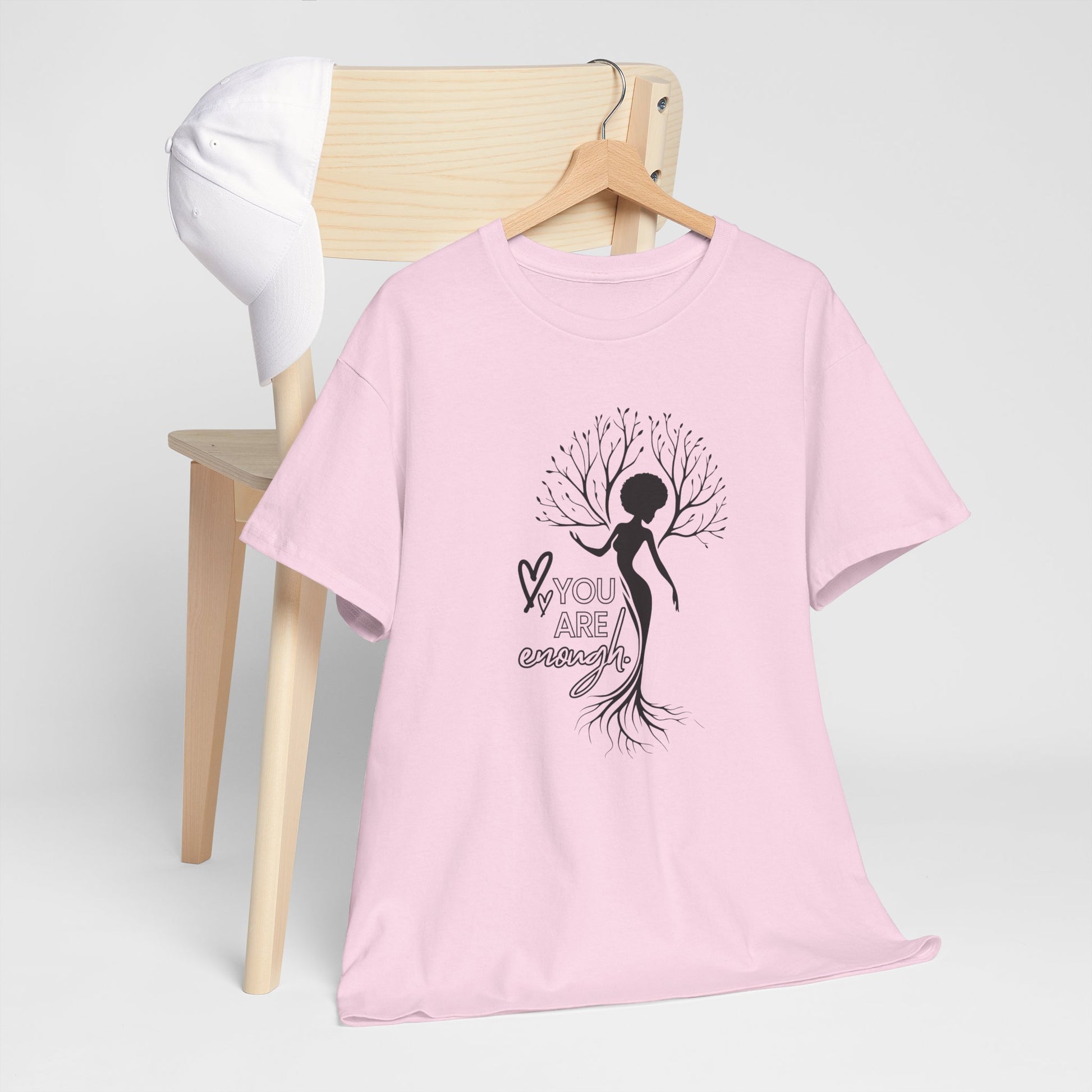 A comfortable and versatile T-Shirt with a positive 'You are enough' design. Perfect for everyday wear, spreading positivity, and uplifting spirits. Ideal for adults looking for a casual yet meaningful addition to their wardrobe. Relevant for self-care reminders, mental health awareness days, and positive affirmation occasions.